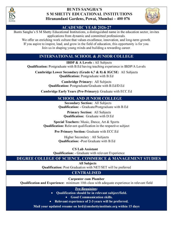 Bunts Sangha’s S M Shetty High School & Jr. College is a dynamic and progressive educational institution that aims to provide the best possible education to the students under its care, set within the parameters of sound values and a disciplined environment.